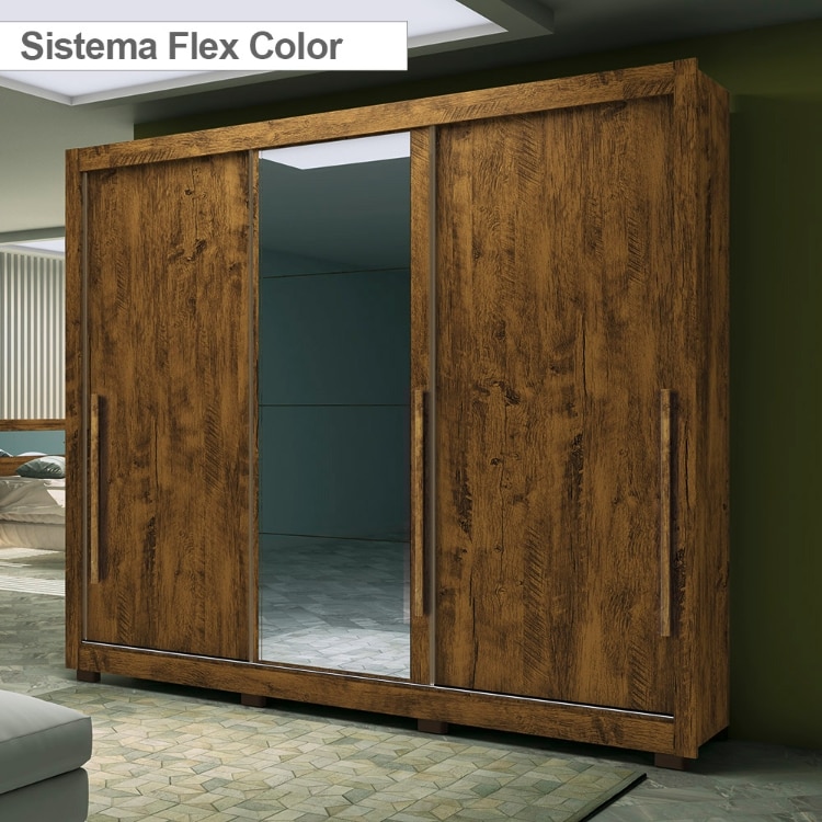 Guarda Roupa 3 Portas De Correr E 5 Gavetas Monaco Com Espelho Castanho Wood Ou Castanho
