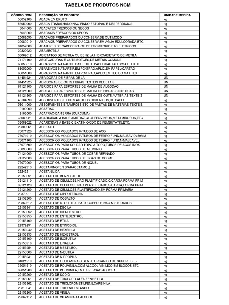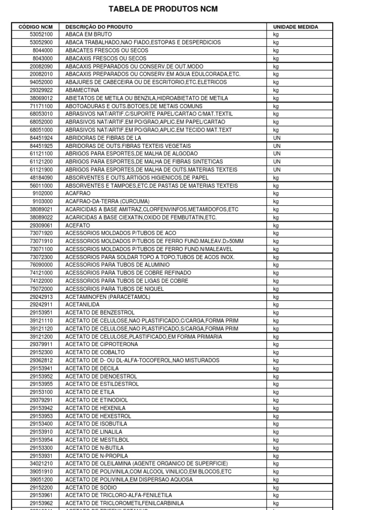 Pdf Tabela De Produtos Ncm Codigo Ncm Descricao Do Produto Unidade Medida Porto Seguro Academia Edu